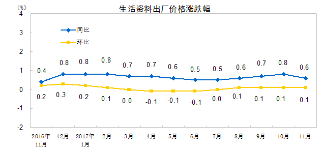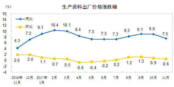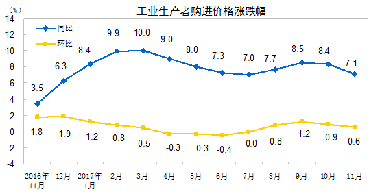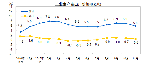2017年11月份,全国工业生产者出厂价格同比上涨5.8%,环比上涨0.5%。工业生产者购进价格同比上涨7.1%,环比上涨0.6%。1-11月平均,工业生产者出厂价格同比上涨6.4%,工业生产者购进价格同比上涨8.3%。